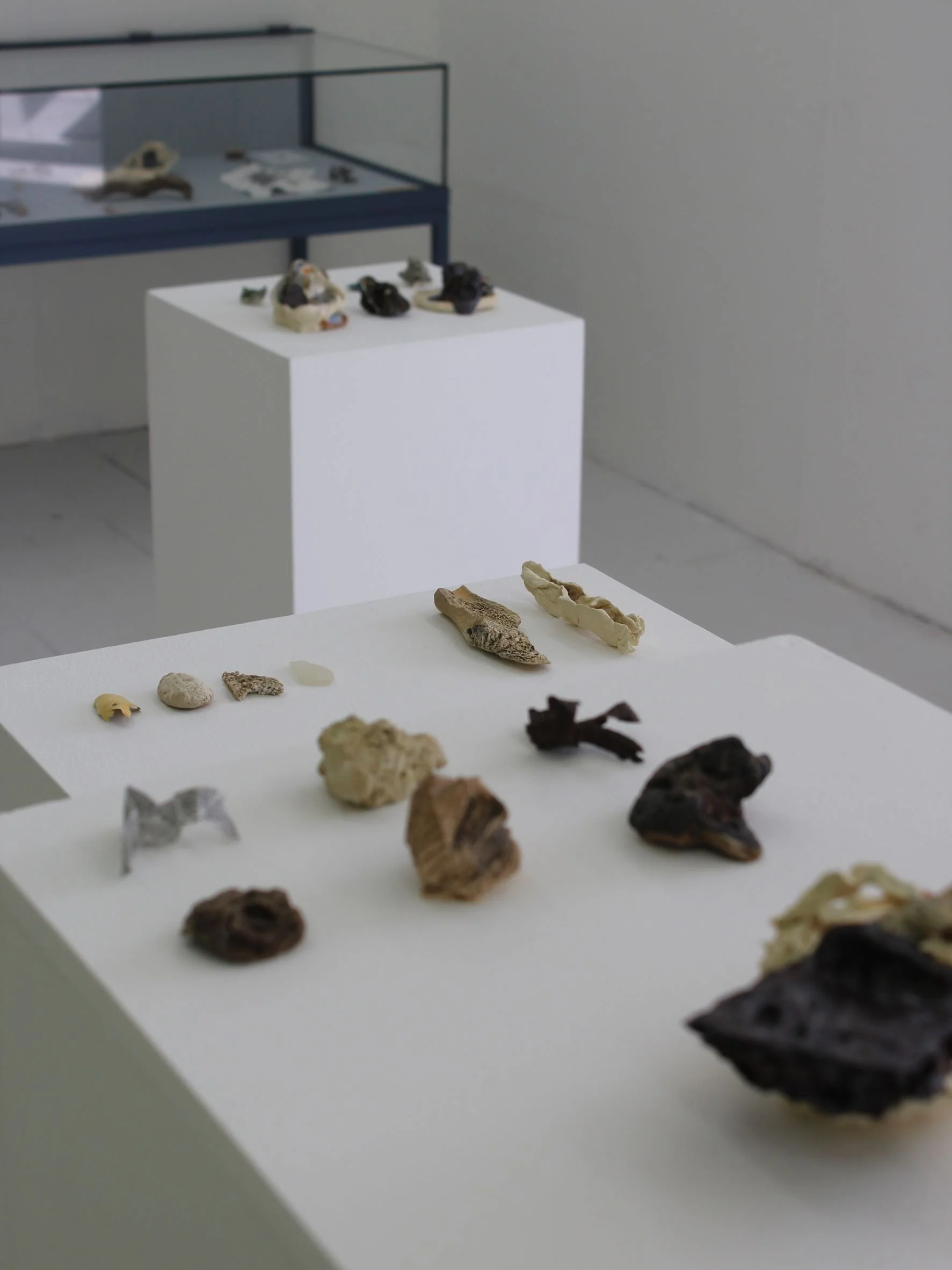 Collection of fired stoneware, glaze, and found objects, curated alongside non-fired found objects, bronze-cast seaweed, and water-soaked poem (the birth of the earth).